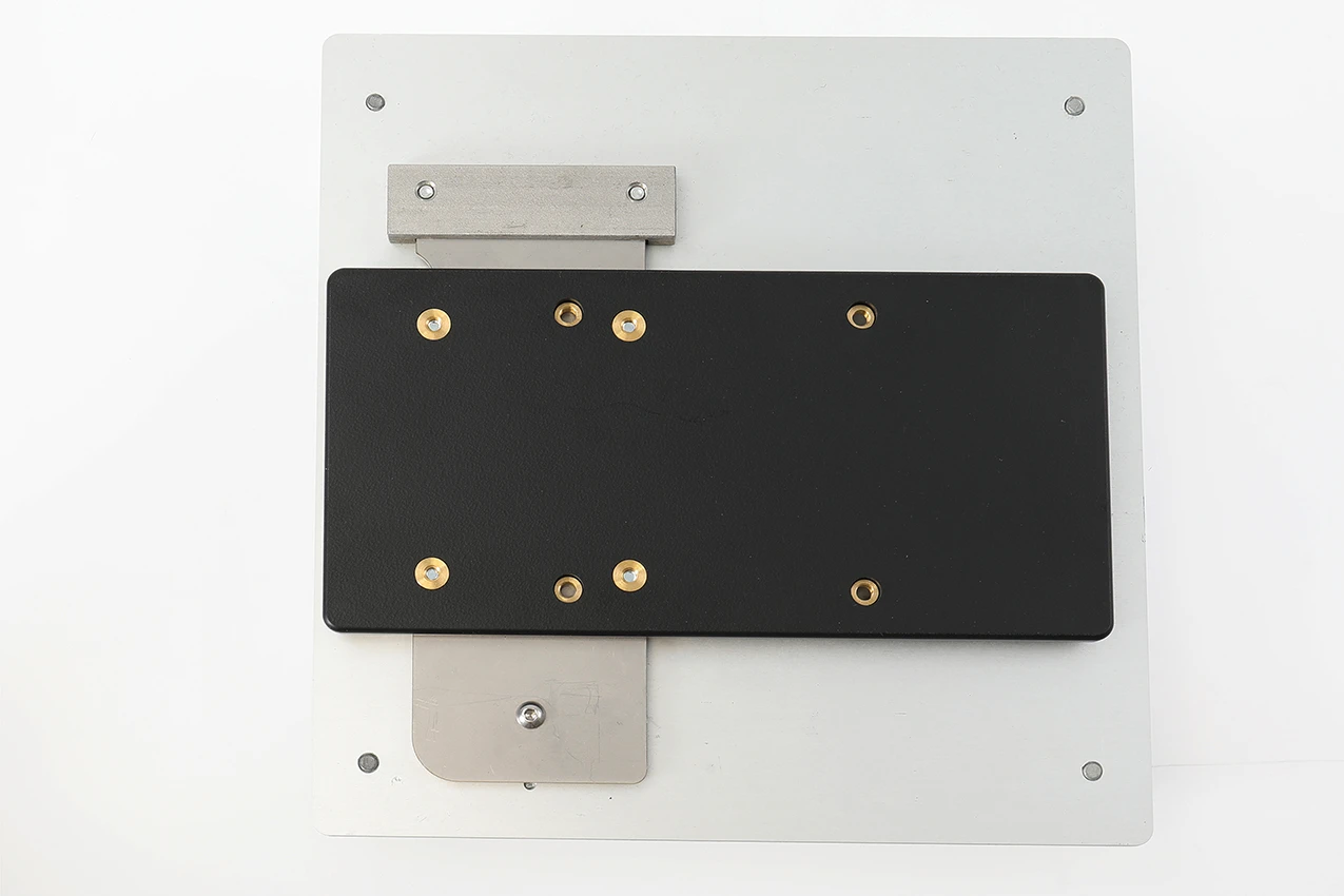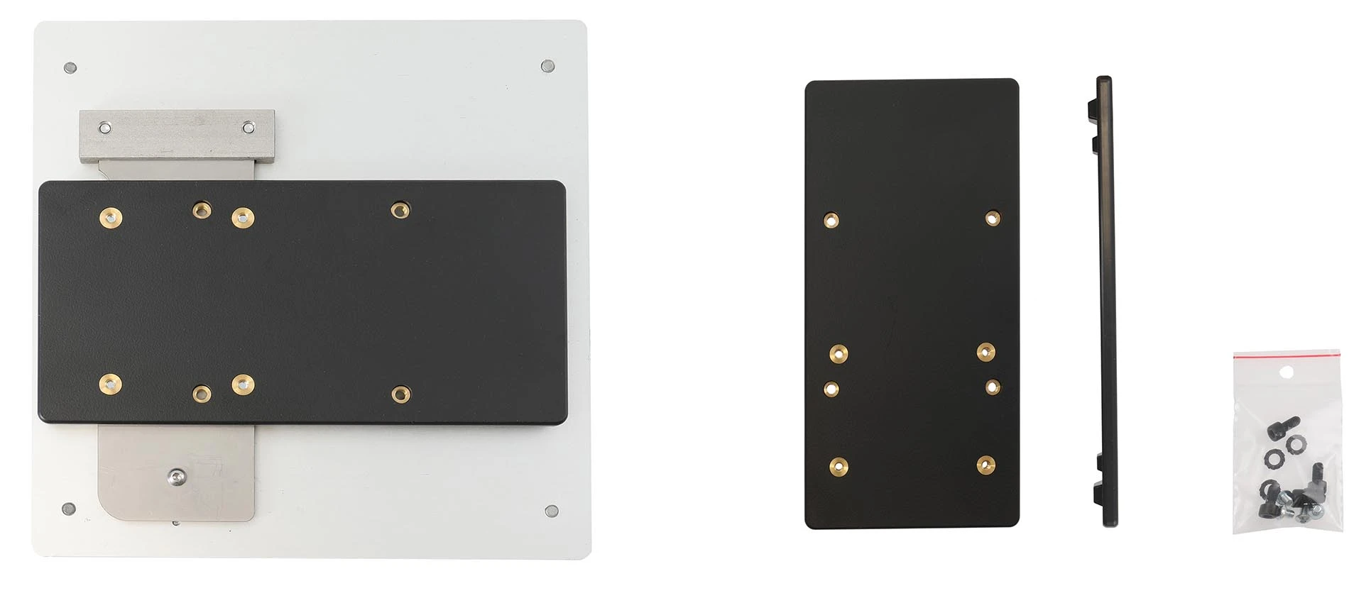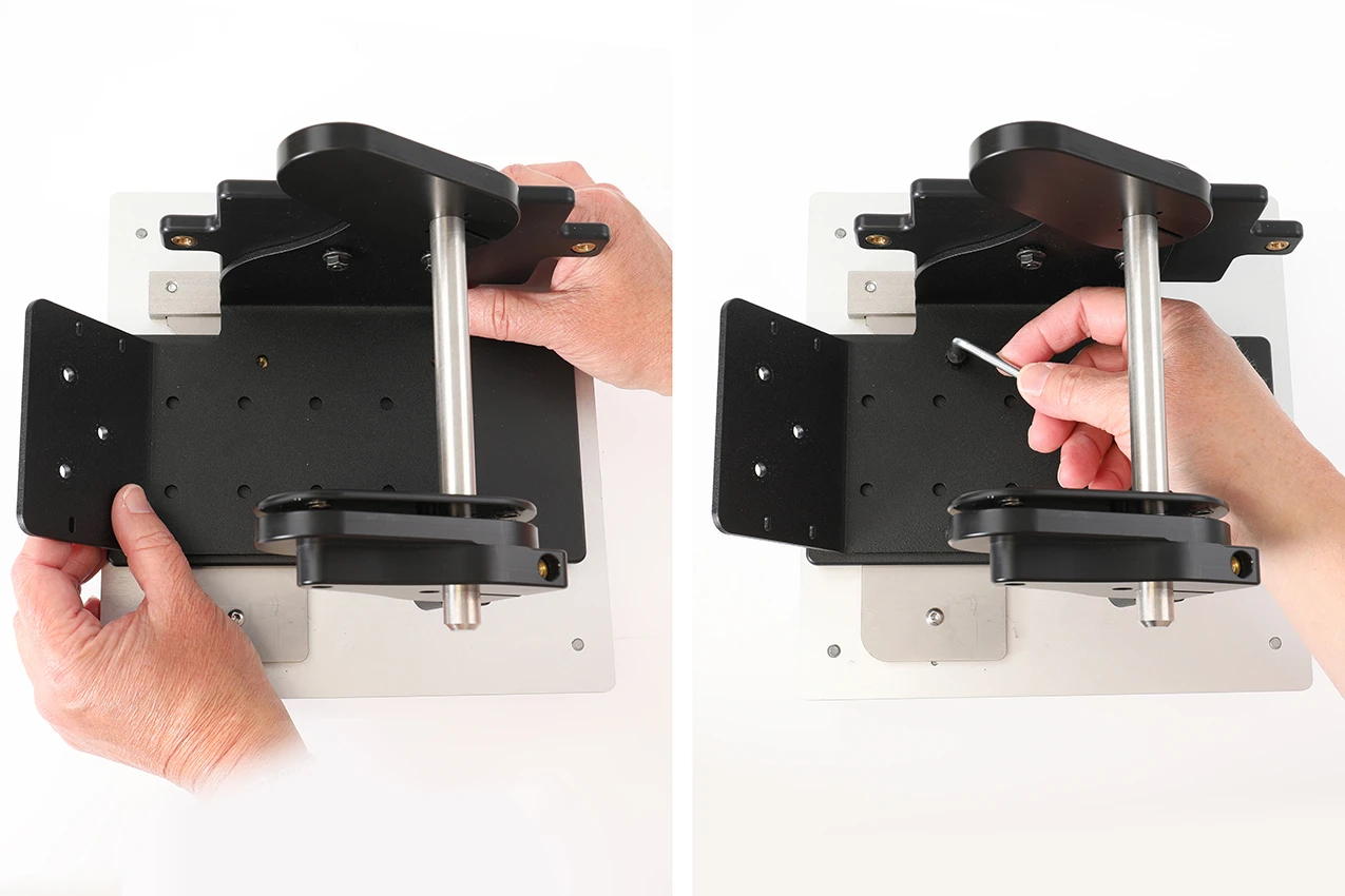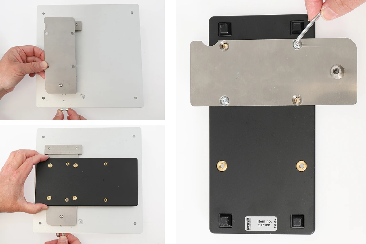 Release the slide latch and remove the printer attachment plate from the plate kit. Place the adapter plate onto the printer attachment plate as shown in the picture, and attach it with the enclosed screws. Put the printer attachment plate -with the adapter plate- back in place in the plate kit and lock it in place with the slide latch.