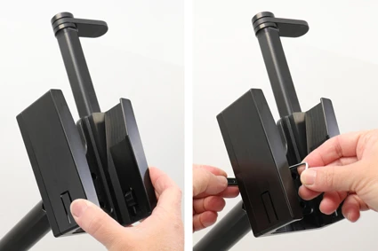 Remove the device: Turn the swiveling top support sideways in order to set the device free. Pull the device straight out from the mount.