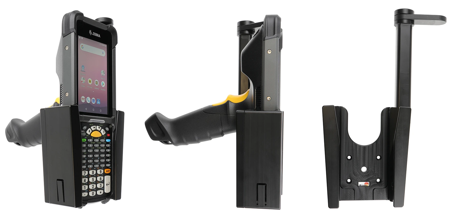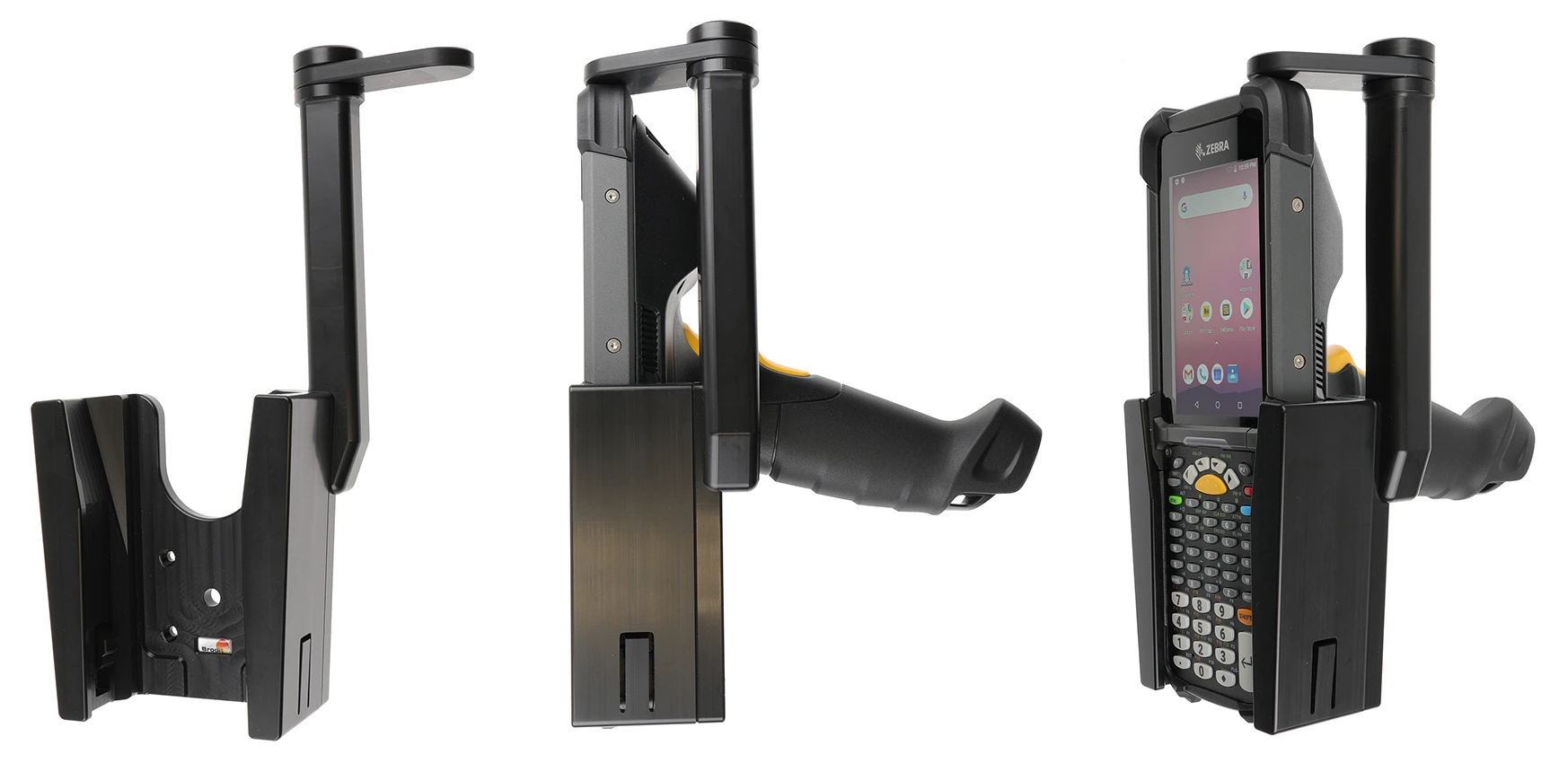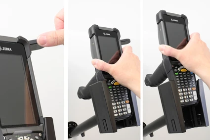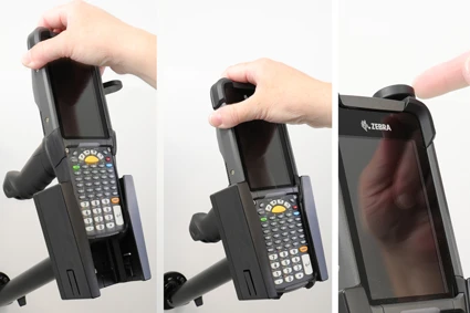 It is easy to place the PDA in the holder, and to take it with you when leaving the vehicle. You can attach e.g. a charging cable to the device while in the holder. Attach onto a Pedestal Mount.