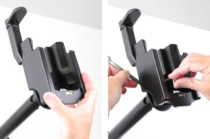 Remove the device: Turn the swiveling top support sideways in order to set the device free. Pull the device straight out from the mount.