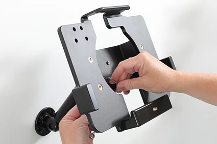 Attach the cradle onto any flat surface or Pedestal Mount in a forklift, truck, distribution vehicle, warehouse, table top etc. Backplate made of steel with 4 mm AMPS and 4 mm VESA 75 standard holes. Made of high grade ABS-, Acetal-plastic and metal. Color: Black. Made in Sweden.