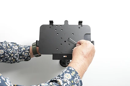 Attach the cradle onto any flat surface or Pedestal Mount in a forklift, truck, distribution vehicle, warehouse, table top etc. With 4 mm AMPS and 4 mm VESA 75 standard holes. Made of high grade ABS-, Acetal-plastic. Color: Black. Made in Sweden.