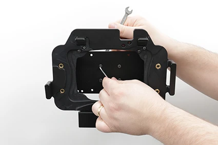 Attach the cradle onto any flat surface or Pedestal Mount in a forklift, truck, distribution vehicle, warehouse, table top etc. Backplate made of steel with 4 mm AMPS and 4 mm VESA 75 standard holes. Made of high grade ABS-, Acetal-plastic and metal. Color: Black. Made in Sweden.