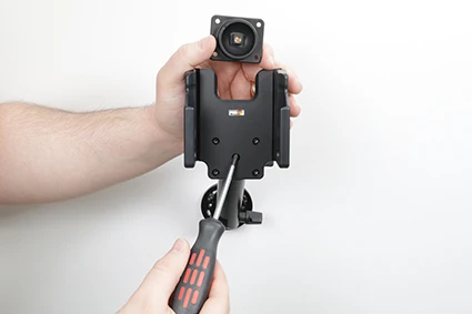 The holder is equipped with a tilt swivel so you can easily adjust the angle for better viewing, or switch between portrait and landscape mode. Tilts 17° and swivels 360°. Mounting plate 42x50 mm with 4 mm AMPS-holes. Made of high grade black ABS/Acetal plastic. Color: black. Made in Sweden. Attach onto a Pedestal Mount.