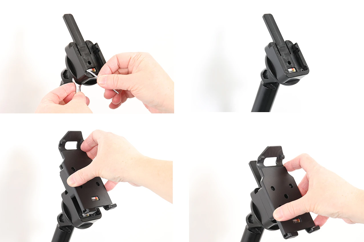 To put the holder with the device in it in place: Slide the holder downward onto the MultiMoveClip so it snaps into place. To remove th holder with the device in it: Press forward on the long part of the MultiMoveClip to release the latch, at the same time slide the holder upward away from the MultiMoveClip.