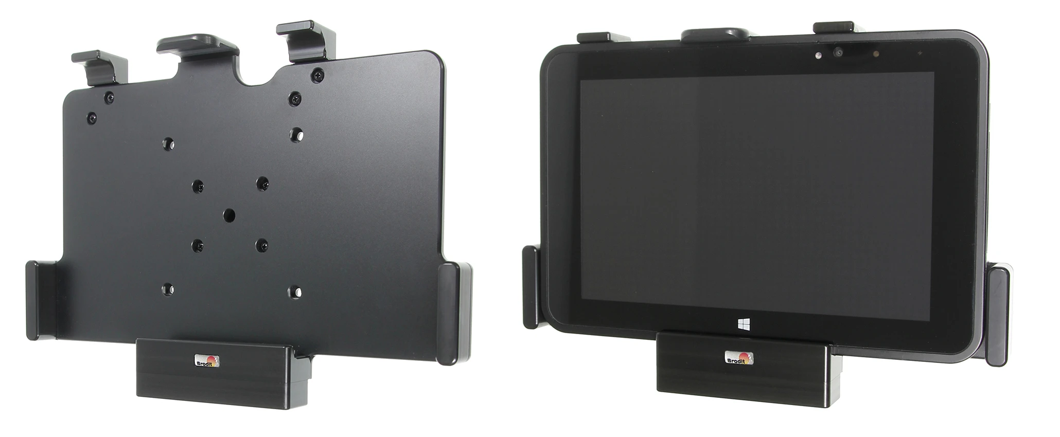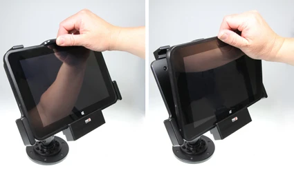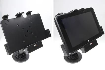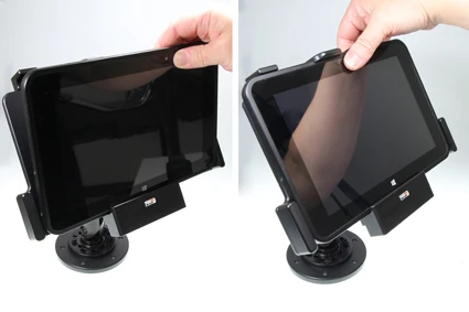 This holder is the perfect choice when you want to have your device firmly in place within easy reach. Custom fit for bare devices (NOT for use with expansion module/handstrap/rugged frame). Attach the holder to any flat surface or a Pedestal Mount in a truck, distribution vehicle, warehouse etc. You have full access to the camera and all buttons and outlets when the device is in the holder.