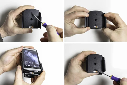 To adjust the holder for your device: Loosen the screws on the front side of the holder, so the sides of the holders can be adjusted. Place the device in the holder and press the sides together so the device is firmly in place. Tighten the screws on the front side of the holder.