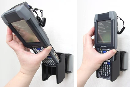 To place the device in the holder: Place the bottom part of the device into the holder. Press the top of the device forward and in the same time slide the device downward into place in the holder.