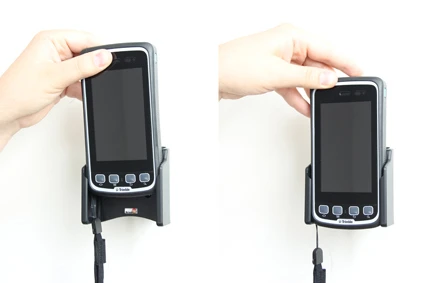 To place the device in the holder: Place the bottom part of the device into the holder. Press the top of the device forward and in the same time slide the device downward into place in the holder. To remove the device from the holder: Press the upper part of the holder forward. When the device is set free, lift it upward out of the holder.