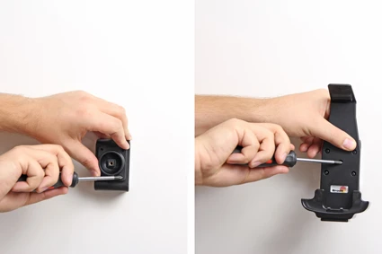 Place the attaching plate onto the desired position. Screw the attaching plate into place with the enclosed screws. Place the holder over the attaching plate so the screw fits in the hole in the tilt swivel. Tighten the screw so the holder is firmly in place, but still can be adjusted.