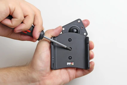 Place the holder over the attaching plate so the screw fits in the hole in the tilt swivel. Screw a few turns on the screw, just so the thread starts to pull. Pull the holder toward you and hold it slightly tensed, in the same time tighten the screw so the holder is pulled toward the tilt swivel. Tighten the screw firm at first, then loosen it a bit so the holder is firmly in place, but still can be adjusted.