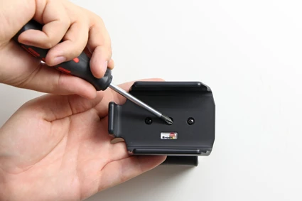 Place the holder over the attaching plate so the screw fits in the hole in the tilt swivel. Screw a few turns on the screw, just so the thread starts to pull. Pull the holder toward you and hold it slightly tensed, in the same time tighten the screw so the holder is pulled toward the tilt swivel. Tighten the screw firm at first, then loosen it a bit so the holder is firmly in place, but still can be adjusted.