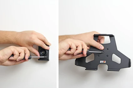 Place the attaching plate onto the desired position. Screw the attaching plate into place with the enclosed screws. Place the holder over the attaching plate so the screw fits in the hole in the tilt swivel. Screw a few turns on the screw, just so the thread starts to pull. Pull the holder toward you and hold it slightly tensed, in the same time tighten the screw so the holder is pulled toward the tilt swivel. Tighten the screw until the holder is firmly in place, but still can be adjusted.