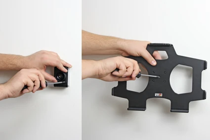 Place the attaching plate onto the desired position. Screw the attaching plate into place with the enclosed screws. Place the holder over the attaching plate so the screw fits in the hole in the tilt swivel. Screw a few turns on the screw, just so the thread starts to pull. Pull the holder toward you and hold it slightly tensed, in the same time tighten the screw so the holder is pulled toward the tilt swivel. Tighten the screw until the holder is firmly in place, but still can be adjusted.