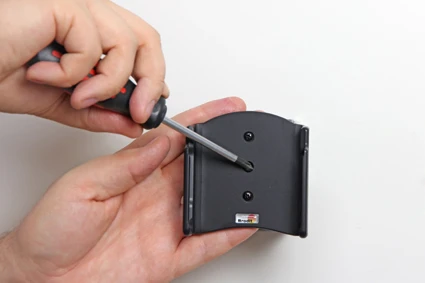 Place the holder over the attaching plate so the screw fits in the hole in the tilt swivel. Screw a few turns on the screw, just so the thread starts to pull. Pull the holder toward you and hold it slightly tensed, in the same time tighten the screw so the holder is pulled toward the tilt swivel. Tighten the screw firm at first, then loosen it a bit so the holder is firmly in place, but still can be adjusted.