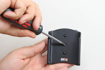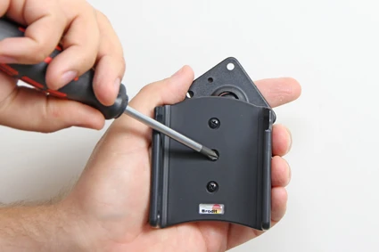 Place the holder over the attaching plate so the screw fits in the hole in the tilt swivel. Screw a few turns on the screw, just so the thread starts to pull. Pull the holder toward you and hold it slightly tensed, in the same time tighten the screw so the holder is pulled toward the tilt swivel. Tighten the screw firm at first, then loosen it a bit so the holder is firmly in place, but still can be adjusted.