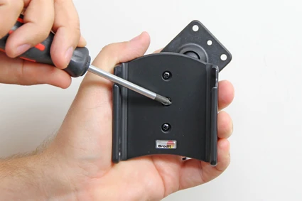 Place the holder over the attaching plate so the screw fits in the hole in the tilt swivel. Screw a few turns on the screw, just so the thread starts to pull. Pull the holder toward you and hold it slightly tensed, in the same time tighten the screw so the holder is pulled toward the tilt swivel. Tighten the screw firm at first, then loosen it a bit so the holder is firmly in place, but still can be adjusted.