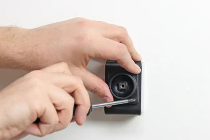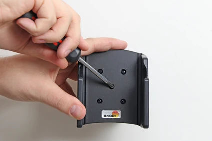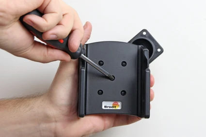 Place the attaching plate onto the desired position. Screw the attaching plate into place with the enclosed screws. Place the holder over the attaching plate so the screw fits in the hole in the tilt swivel. Screw a few turns on the screw, just so the thread starts to pull. Pull the holder toward you and hold it slightly tensed, in the same time tighten the screw so the holder is pulled toward the tilt swivel. Tighten the screw until the holder is firmly in place, but still can be adjusted.