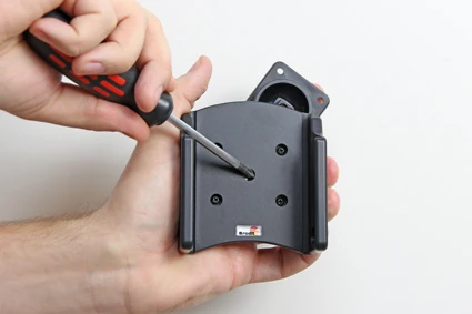 Place the attaching plate onto the desired position. Screw the attaching plate into place with the enclosed screws. Place the holder over the attaching plate so the screw fits in the hole in the tilt swivel. Screw a few turns on the screw, just so the thread starts to pull. Pull the holder toward you and hold it slightly tensed, in the same time tighten the screw so the holder is pulled toward the tilt swivel. Tighten the screw until the holder is firmly in place, but still can be adjusted.
