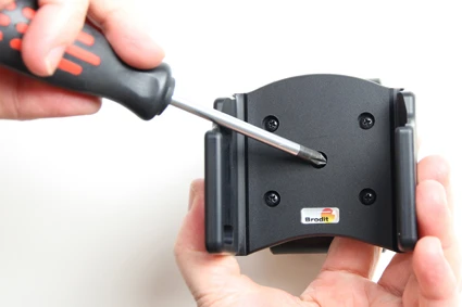 Place the holder over the attaching plate so the screw fits in the hole in the tilt swivel. Screw a few turns on the screw, just so the thread starts to pull. Pull the holder toward you and hold it slightly tensed, in the same time tighten the screw so the holder is pulled toward the tilt swivel. Tighten the screw firm at first, then loosen it a bit so the holder is firmly in place, but still can be adjusted.