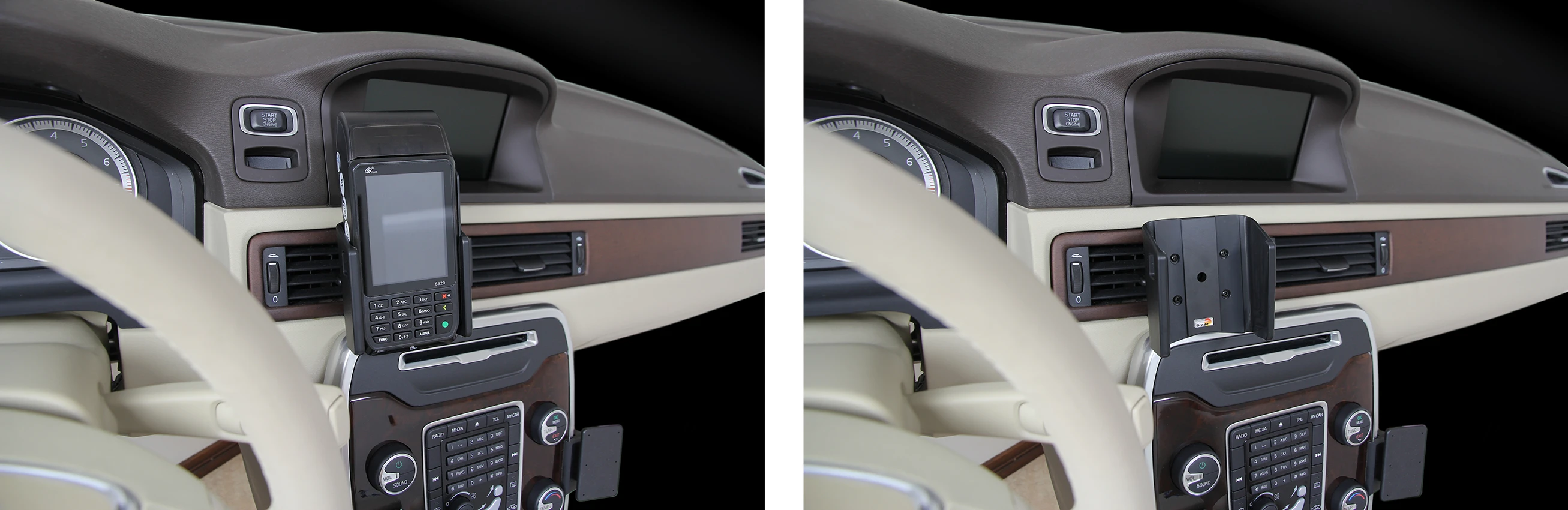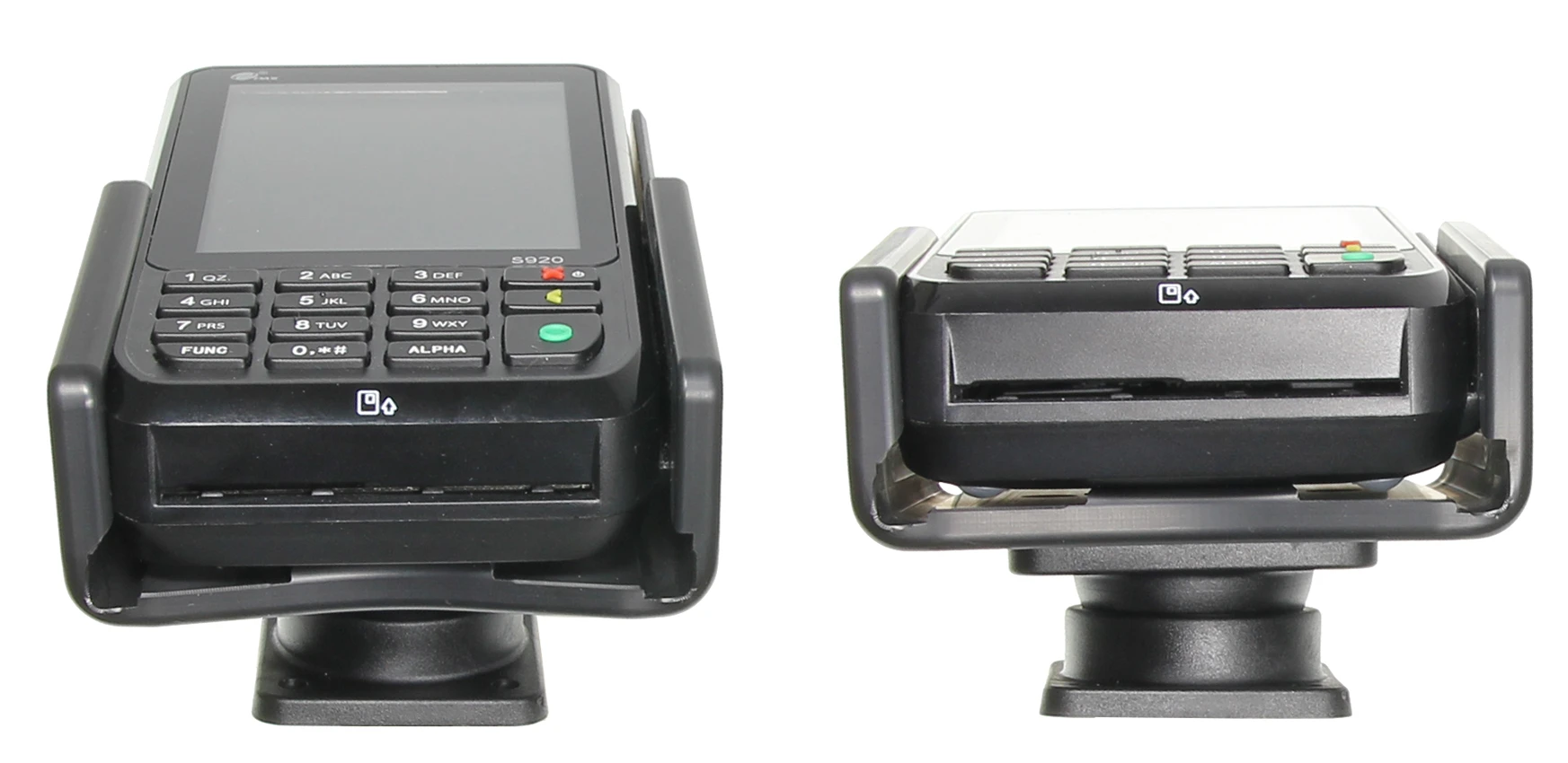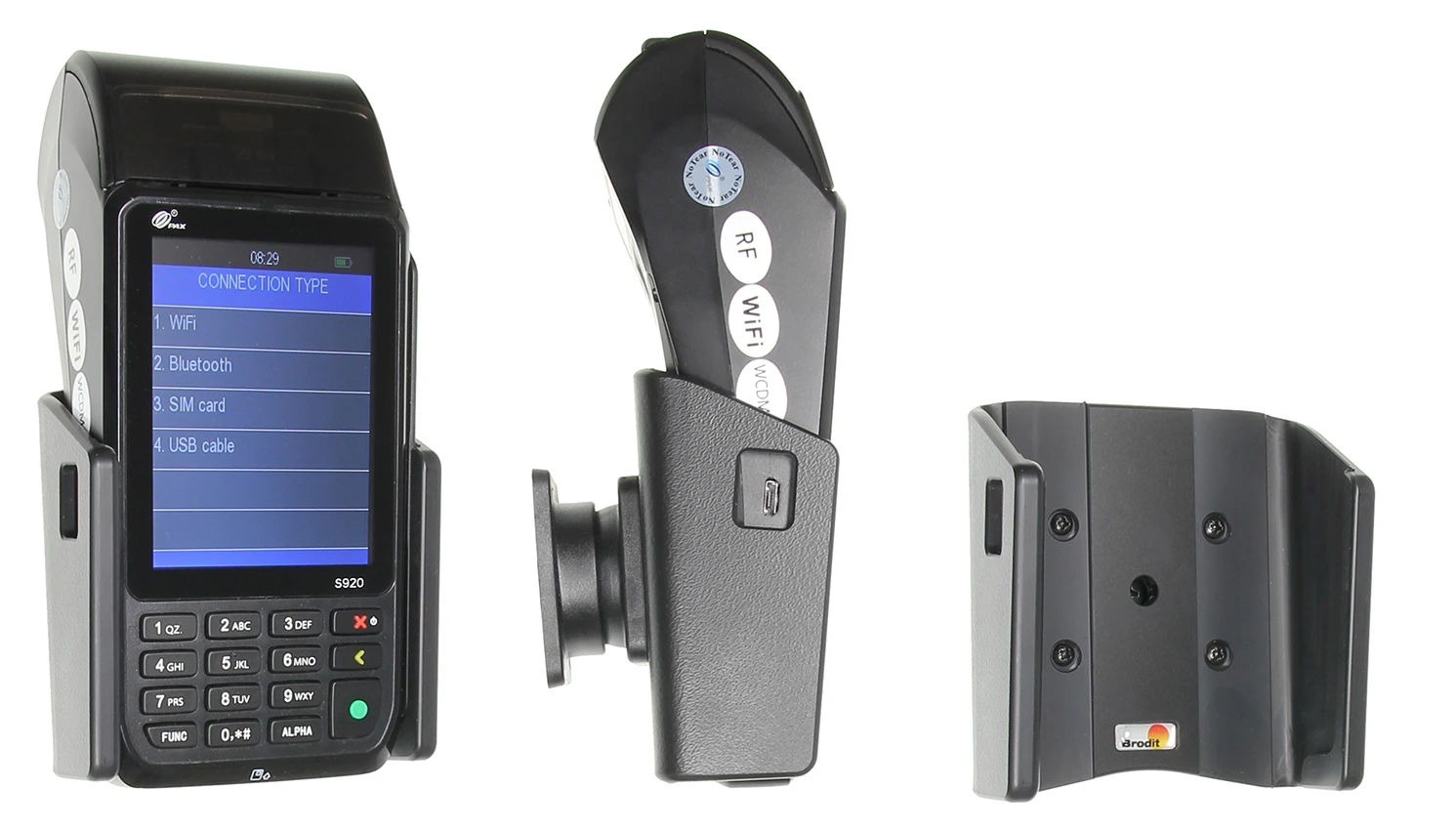 The holders for myPOS S920 are extra durable, designed to withstand rough working conditions in professional use. With your rugged PDA in a passive holder attached onto the dashboard it is always within easy reach -safe and convenient. The holder is mounted onto a tilt swivel so it is adjustable for avoiding light reflection on the screen. It is easy to put the PDA in the holder, and to take it out of the holder. You can connect e.g. a charging cable to the PDA when it is in the holder.
