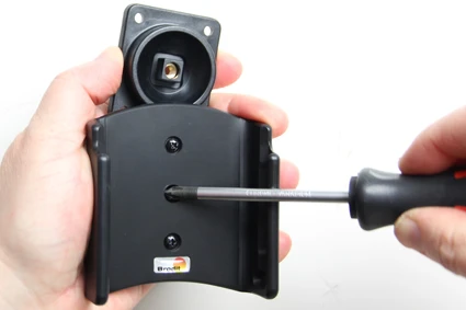 Place the holder over the attaching plate so the screw fits in the hole in the tilt swivel and screw it into place. Tighten the screw firm at first, then loosen it a bit so the holder is firmly in place, but still can be adjusted.