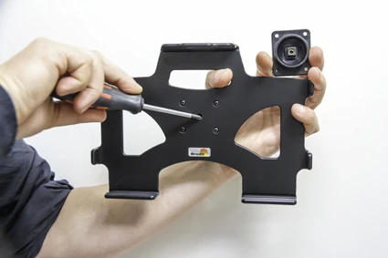 Place the attaching plate onto the desired position. Screw the attaching plate into place with the enclosed screws. Place the holder over the attaching plate so the screw fits in the hole in the tilt swivel. Tighten the screw until the holder is firmly in place, but still can be adjusted.