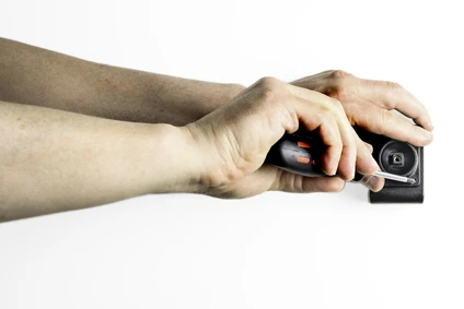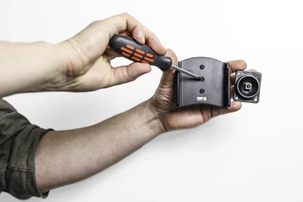 Place the holder over the attaching plate so the screw fits in the hole in the tilt swivel and screw it into place. Tighten the screw firm at first, then loosen it a bit so the holder is firmly in place, but still can be adjusted.