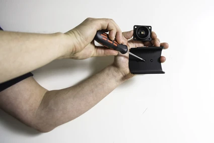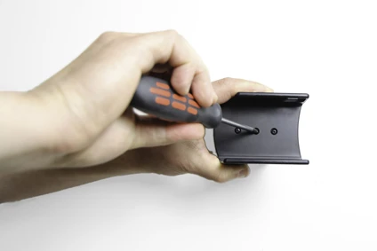 Place the holder over the attaching plate so the tilt swivel fits. Screw the holder onto the attaching plate.