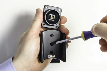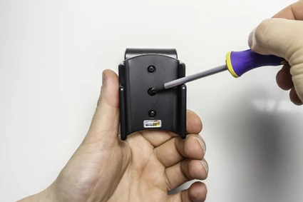 Place the holder over the attaching plate so the screw fits in the hole in the tilt swivel. Screw a few turns on the screw, just so the thread starts to pull. Pull the holder toward you and hold it slightly tensed, in the same time tighten the screw so the holder is pulled toward the tilt swivel. Tighten the screw firm at first, then loosen it a bit so the holder is firmly in place, but still can be adjusted.