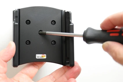 Place the attaching plate onto the desired position. Screw the attaching plate into place with the enclosed screws. Place the holder over the attaching plate so the screw fits in the hole in the tilt swivel. Screw a few turns on the screw, just so the thread starts to pull. Pull the holder toward you and hold it slightly tensed, in the same time tighten the screw so the holder is pulled toward the tilt swivel. Tighten the screw until the holder is firmly in place, but still can be adjusted.