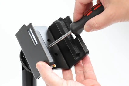 Place the holder over the attaching plate so the tilt swivel fits. Screw the holder onto the attaching plate.