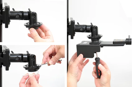 Place the attaching plate onto the desired position. Screw the attaching plate into place with the enclosed screws. Place the holder over the attaching plate so the screw fits in the hole in the tilt swivel. Tighten the screw so the holder is firmly in place, but still can be adjusted.