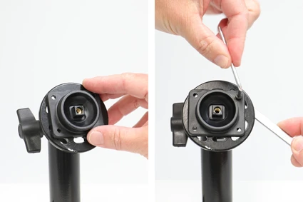 Place the holder over the attaching plate so the screw fits in the hole in the tilt swivel. Tighten the screw so the holder is firmly in place, but still can be adjusted.