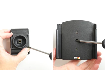 To adjust the holder for your device: Loosen the screws on the front side of the holder, so the sides of the holders can be adjusted. Place the device in the holder and press the sides together so the device is firmly in place. Tighten the screws on the front side of the holder.