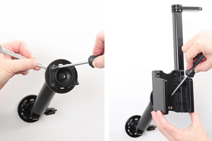 Place the attaching plate onto the desired position. Screw the attaching plate into place with the enclosed screws. Place the holder over the attaching plate so the screw fits in the hole in the tilt swivel. Tighten the screw until the holder is firmly in place, but still can be adjusted.