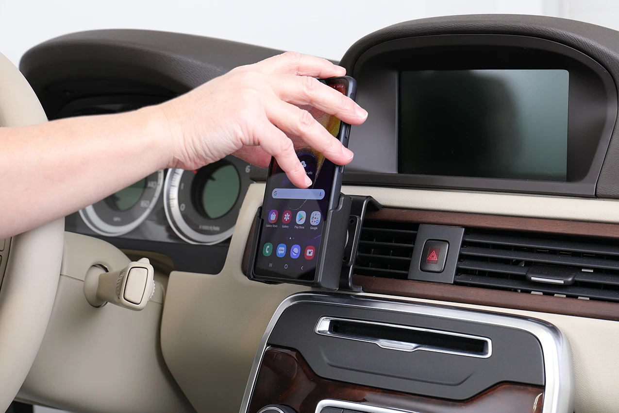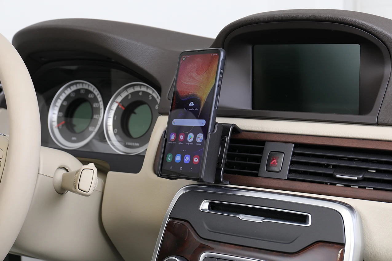 Keep your phone in a passive holder and you will always have it within easy sight and reach! Neat, discreet and convenient. Custom made with a perfect, firm fit. You have full access to the camera and all buttons and outlets when the device is in the holder. You can connect a charging cable or portable handsfree to the device when it is in the holder.