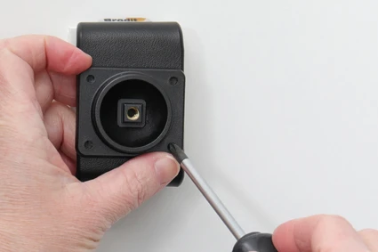 Place the holder over the attaching plate so the screw fits in the hole in the tilt swivel and screw it into place. Tighten the screw so the holder is firmly in place, but still can be adjusted.