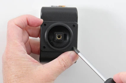 Place the holder over the attaching plate so the screw fits in the hole in the tilt swivel and screw it into place. Tighten the screw so the holder is firmly in place, but still can be adjusted.