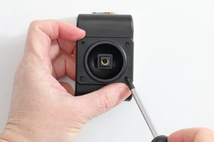 Place the holder over the attaching plate so the screw fits in the hole in the tilt swivel and screw it into place. Tighten the screw so the holder is firmly in place, but still can be adjusted.