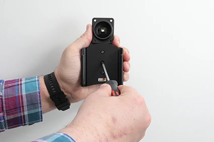 Place the holder over the attaching plate so the screw fits in the hole in the tilt swivel and screw it into place. Tighten the screw so the holder is firmly in place, but still can be adjusted.