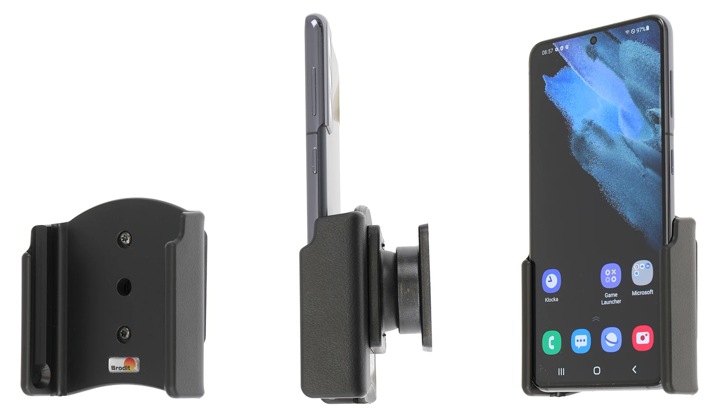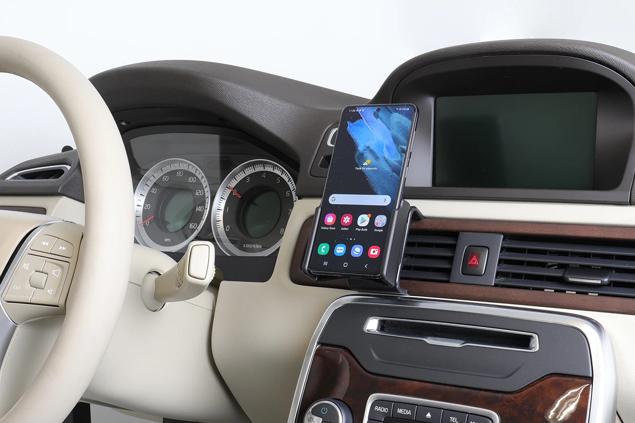 Keep your phone in a passive holder and you will always have it within easy sight and reach! Neat, discreet and convenient. Custom made with a perfect, firm fit. You have full access to the camera and all buttons and outlets when the device is in the holder. You can connect a charging cable or portable handsfree to the device when it is in the holder.