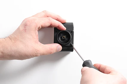 Place the holder over the attaching plate so the screw fits in the hole in the tilt swivel and screw it into place. Tighten the screw so the holder is firmly in place, but still can be adjusted.