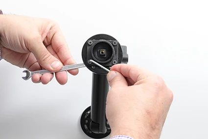 Place the holder over the attaching plate so the screw fits in the hole in the tilt swivel and screw it into place. Tighten the screw so the holder is firmly in place, but still can be adjusted.