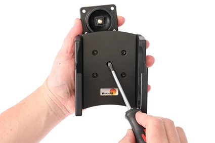 Place the holder over the attaching plate so the screw fits in the hole in the tilt swivel and screw it into place. Tighten the screw so the holder is firmly in place, but still can be adjusted.