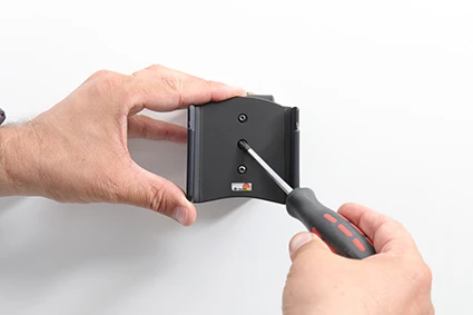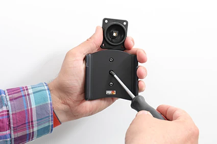 Place the holder over the attaching plate so the screw fits in the hole in the tilt swivel and screw it into place. Tighten the screw so the holder is firmly in place, but still can be adjusted.