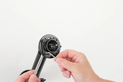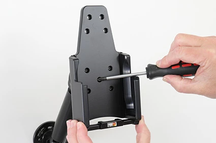 Place the holder over the attaching plate so the screw fits in the hole in the tilt swivel and screw it into place. Tighten the screw so the holder is firmly in place, but still can be adjusted.