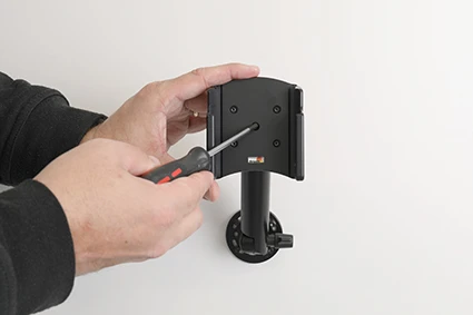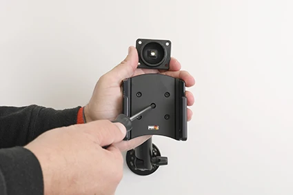 The holder is equipped with a tilt swivel so you can easily adjust the angle for better viewing, or switch between portrait and landscape mode. Tilts 17° and swivels 360°. Mounting plate 42x50 mm with 4 mm AMPS-holes. Made of high grade black ABS/Acetal plastic. Color: black. Made in Sweden. Attach onto a ProClip Mounting Platform or a Pedestal Mount.