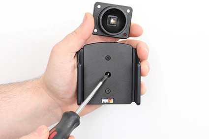 To adjust the holder for your device: Loosen the screws on the front side of the holder, so the sides of the holders can be adjusted. Place the device in the holder and press the sides together so the device is firmly in place. Tighten the screws on the front side of the holder.