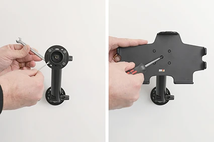 Place the attaching plate onto the desired position. Screw the attaching plate into place with the enclosed screws. Place the holder over the attaching plate so the screw fits in the hole in the tilt swivel. Tighten the screw until the holder is firmly in place, but still can be adjusted.